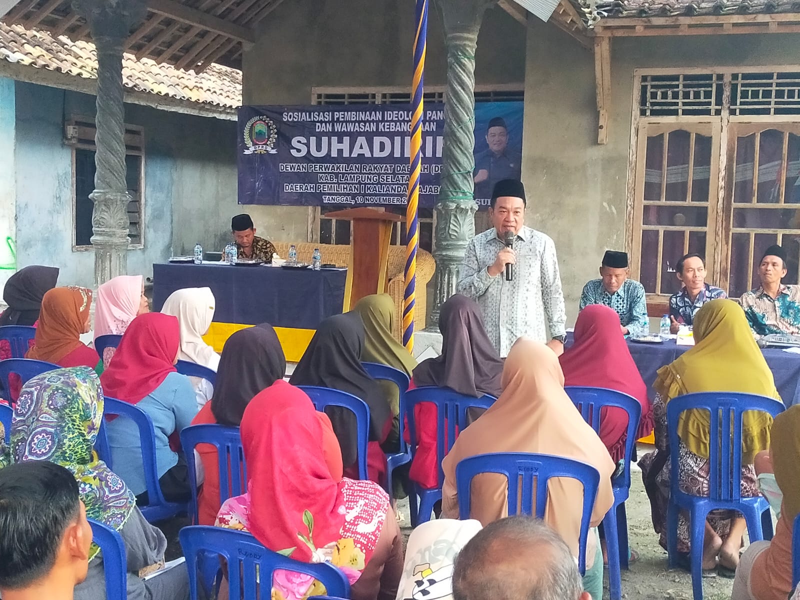 Lamsel, mediamerdeka.co – Anggota DPRD Lampung Selatan Suhadirin gelar sosialisasi pembinaan Ideologi Pancasila da Wawaan Kebangsaan (IPWK) di Desa Marga Catur Kecamatan Kalianda, Lamsel, (10/11/2025).