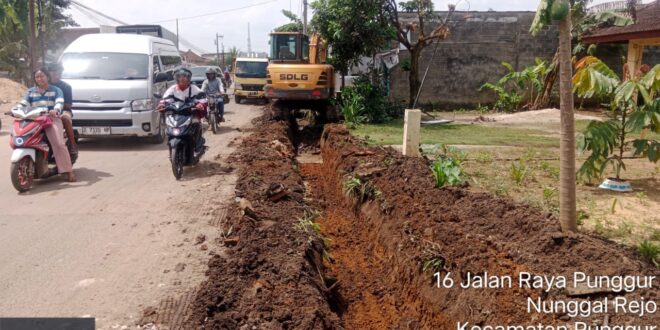 Di ruas Kali Rejo – Bangun Rejo, petugas melakukan pengerukan saluran air serta penimbunan jalan berlubang agar tetap dapat dilalui kendaraan masyarakat dengan aman.