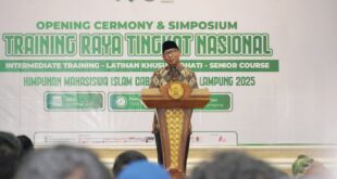 Bandar Lampung (MM) — Gubernur Lampung, Rahmat Mirzani Djausal membuka Training Raya Tingkat Nasional Himpunan Mahasiswa Islam (HMI) Cabang Bandar Lampung di Gedung Balai Keratun Lantai 3, Sabtu (25/10/2025). Kegiatan tersebut mengangkat tema “Transformation of Thought, Collaboration of Character Acceleration, Intellectual Capacity and Islamic Spirituality to a Nation Challenge” yang …