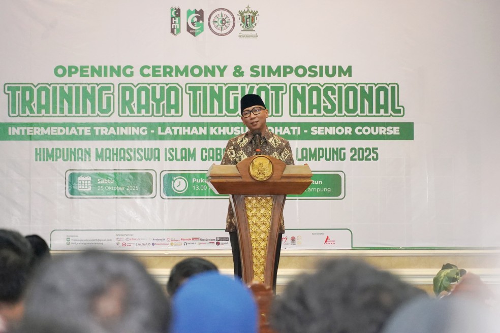 Bandar Lampung (MM) — Gubernur Lampung, Rahmat Mirzani Djausal membuka Training Raya Tingkat Nasional Himpunan Mahasiswa Islam (HMI) Cabang Bandar Lampung di Gedung Balai Keratun Lantai 3, Sabtu (25/10/2025).