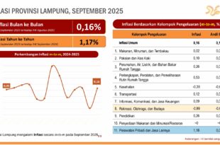 BANDAR LAMPUNG (MM) – Provinsi Lampung mencatat inflasi sebesar 0,16 persen secara bulanan (month to month/mtm) pada September 2025. Angka ini lebih rendah dibandingkan inflasi nasional yang berada di level 0,21 persen (mtm), menunjukkan stabilitas harga di daerah terus terjaga. Badan Pusat Statistik (BPS) Provinsi Lampung melaporkan, secara tahunan (year …