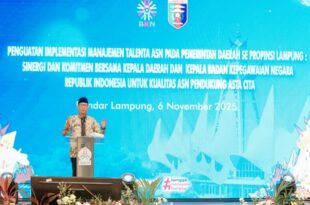 BANDARLAMPUNG —– Gubernur Lampung Rahmat Mirzani Djausal mengajak seluruh Bupati dan Wali Kota di Provinsi Lampung untuk bersama-sama mendorong Aparatur Sipil Negara (ASN) menjadi motor penggerak dalam mewujudkan Asta Cita dan visi misi pemerintah daerah. Ajakan ini disampaikan Gubernur Mirza dalam acara Penguatan Implementasi Manajemen Talenta ASN pada Pemerintah Daerah …