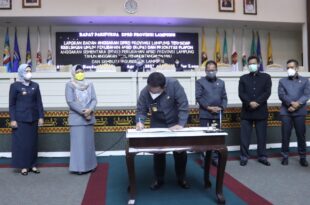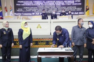 Bandarlampung ( Mediamerdeka) — Gubernur Lampung Arinal Djunaidi bersama Ketua DPRD Provinsi Lampung Mingrum Gumay dan 4 Wakil Ketua DPRD Lampung menandatangani persetujuan bersama Raperda Pertanggungjawaban Pelaksanaan APBD Provinsi Lampung Tahun 2020 di Ruang Sidang DPRD Provinsi Lampung, Jum’at (30/7/2021). Setelah ditandatangi, Raperda selanjutnya akan disampaikan kepada Menteri Dalam Negeri …