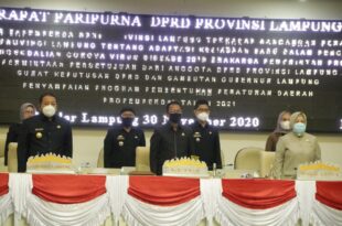 Bandar Lampung, Mediamerdeka.co – Gubernur Lampung, Arinal Djunaidi, menghadiri Rapat Paripurna DPRD Provinsi Lampung Pembicaraan Tingkat II dalam rangka Laporan Badan Pembentukan Peraturan Daerah (Bapemperda) DPRD Provinsi Lampung terhadap Raperda Provinsi Lampung tentang Adaptasi Kebiasaan Baru dalam Pencegahan dan Pengendalian Corona Virus Disease 2019, di Ruang Sidang DPRD Provinsi Lampung, …