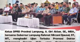 Bandar Lampung,-Ketua DPRD Provinsi Lampung, A. Giri Akbar, SE., MBA., bersama Gubernur Lampung Rahmat Mirzani Djausal, ST., MT., menghadiri Ujian Terbuka Promosi Doktor Muhammad Firsada, M.Si., yang diselenggarakan Pascasarjana Universitas Islam Negeri (UIN) Raden Intan Lampung, di Ballroom UIN Raden Intan Lampung. Kamis (12/02/2026), Promosi doktor tersebut mengangkat disertasi berjudul …