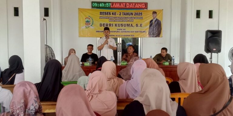 Lampung Selatan , mediamerdeka.co– Anggota DPRD Kabupaten Lampung Selatan, Derri Kusuma, S.E., menggelar reses kedua tahun 2025 di Desa Bumijaya, Kecamatan Candipuro, Minggu (10/8/2025). Kegiatan tersebut dihadiri Kepala Desa Bumijaya Aris Mustofa, perangkat desa, konten kreator Safitri asal Kecamatan Palas, serta para pelaku Usaha Mikro Kecil Menengah (UMKM).