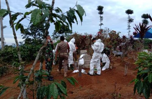 Lampung Barat–Jenazah pasien terkonfirmasi positifi Corona Virus Disease 2019 (Covid-19) selesai dimakamkan di Tempat Pemakaman Umum (TPU) Dusun Srigaluh Kelurahan Sekincau Kecamatan Sekincau Kabupaten Lampung Barat.
