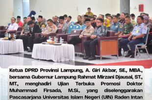 Bandar Lampung — Ketua DPRD Provinsi Lampung, A. Giri Akbar, S.E., M.B.A., bersama Gubernur Lampung Rahmat Mirzani Djausal, S.T., M.T., menghadiri Ujian Terbuka Promosi Doktor Muhammad Firsada, M.Si., yang diselenggarakan Pascasarjana Universitas Islam Negeri Raden Intan Lampung, di Ballroom UIN Raden Intan Lampung, Kamis (12/02/2026). Promosi doktor tersebut mengangkat disertasi …