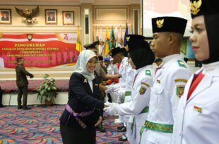 Bandarlampung,(Mediamerdeka.co)–Wakil Gubernur Lampung, Chusnunia Chalim (Nunik) melakukan Pengukuhan Pasukan Pengibar Bendera Pusaka (Paskibraka) Provinsi Lampung Tahun 2019, di Balai Keratun, Komplek Kantor Gubernur Lampung, Jumat (16/8/2019). Para Paskibraka ini nantinya akan bertindak sebagai petugas Upacara Peringatan HUT RI ke- 74, di Lapangan Korpri, Komplek Kantor Gubernur Lampung, pada Sabtu (17/8/2019) …