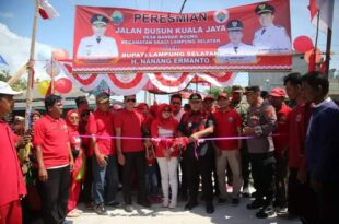 Lamael ( Mediamerdeka)— Dengan mengucapkan“Bismillahirohmanirohim”, Bupati Lampung Selatan H. Nanang Ermanto meresmikan jalan cor beton di Dusun Kuala Jaya, Desa Bandar Agung Kecamatan Sragi, Jumat 13 januari 2023. Ditandai dengan pemotongan pita oleh Bupati Lampung Selatan, didampingi Ketua Tim Penggerak PKK Kab. Lampung Selatan Winarni, jalan sepanjang 1.035 km itu, …
