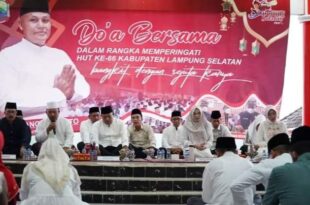 Lamsel ( Mediamerdeka)—-Pemerintah Kabupaten (Pemkab) Lampung Selatan menggelar Doa bersama dalam rangka memperingati Hari Ulang Tahun (HUT) ke-66 Kabupaten Lampung Selatan, di aula sebuku rumah dinas bupati setempat pada Sabtu sore (12/11/2022). Doa bersama tersebut dibuka langsung oleh Bupati Lampung Selatan H. Nanang Ermanto dengan dipandu oleh K.H Almukhlisin M.Pd, …