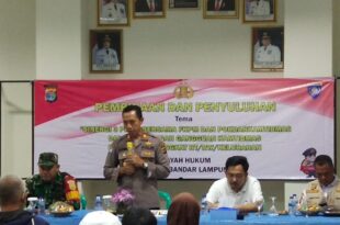 Bandarlampung ( Mediamerdeka)—Satuan Binmas Polresta Bandar Lampung melaksanakan Pembinaan dan Penyuluhan serta Sosialisasi Polmas untuk mengatasi permasalahan kamtibmas dan Strategi mencegah tindak kejahatan khususnya Curas, Curat dan Curanmor (C3) di Kantor kelurahan Sukarame, pada jumat malam (14/10/2022). Kegiatan penyuluhan tersebut dilaksanakan oleh Kasat Binmas AKP Kurmen Rubiyanto, SH., M.M. Turut …