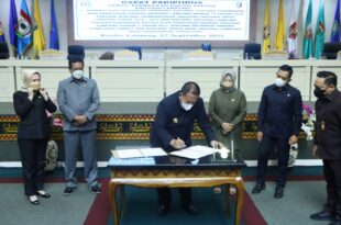 bANDARLAMPUNG (Mediamerdeka)— Gubernur Lampung Arinal Djunaidi Tandatangani Nota Kesepakatan Kebijakan Umum APBD dan Prioritas Plafon Anggaran Sementara Tahun Anggaran 2023, di Ruang Sidang Paripurna DPRD Lampung, Jumat (14/10/2022). Sidang Paripurna yang dipimpin Wakil Ketua DPRD Lampung, Hj. Elly Wahyuni, SE., MM dan Anggota Dewan yang Hadir rapat paripurna pada rapat …