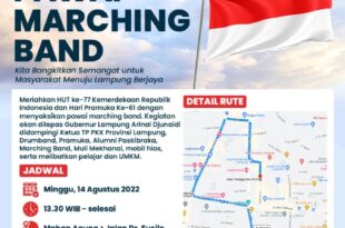 Bandarlampung ( Mediamerdeka)—–Meskipun dalam suasana mendung, Kirab Marching Band dalam rangka HUT RI Ke-77 yang diinisiasi oleh Pemprov Lampung dan Persatuan Drum Band Indonesia (PDBI) Provinsi Lampung disambut meriah oleh ribuan masyarakat Lampung disepanjang Jalan Dr. Susilo, Jalan Pangeran Diponegoro, Jalan Ahmad Yani, Jalan Kartini, Jalan Letjend katamso, Jalan Raden …
