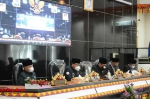 Metro (Mediamerdeka)—-Dewan Perwakilan Rakyat Daerah Kota Metro menggelar rapat Paripurna tentang penyampaian SK DPRD Kota Metro tentang Rekomendasi atas Laporan Keterangan Pertanggung Jawaban (LKPJ) Walikota Metro Tahun Anggaran 2021, di ruang sidang DPRD setempat, Senin (4/4/22). Rapat dipimpin langsung oleh Ketua DPRD Kota Metro, dan dihadiri Forkopimda Kota Metro, Sekda …