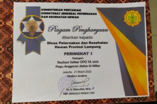 Bandarlampung ( Mediamerdeka)—-Dinas Peternakan dan Kesehatan Hewan Provinsi Lampung, meraih prestasi Peringkat I Nasional, Realisasi Satuan Kerja (Satker) Organisasi Perangkat Daerah (OPD) Tahun Anggaran (TA) 2021 Pagu Anggaran diatas 10 Miliar. Penghargaan dari Dirjen Peternakan dan Kesehatan Hewan (PKH), Kementerian Pertanian, tersebut diterima Sekretatis Dinas, drh. Anwar Fuadi. MPH, mewakili …
