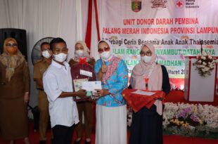 Bandarlampung ( Mediamerdeka)—- Ketua PMI Provinsi Lampung, Riana Sari Arinal mengunjungi Unit Donor Darah (UDD) PMI Lampung untuk menemui anak – anak penderita thalasemia, Senin (21/03/2022). Thalasemia adalah kelainan darah bawaan yang ditandai dengan kurangnya protein pembawa oksigen (hemoglobin) dan jumlah sel darah merah dalam tubuh yang kurang dari normal, …