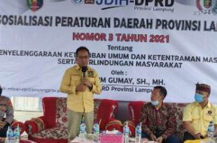 Lampung Tengah (Mediamerdeka)-Ketua DPRD Provinsi Lampung menggelar sosialisasi peraturan daerah (Sosperda) Nomor 3 Tahun 2021 tentang penyelenggaraan ketertiban umum dan ketentramaan masyarakat serta perlindungan masyarakat yang dilaksanakan di kecamatan Selagai Lingga, Lampung Tengah, Sabtu (12/03) Dalam sambutannya, Ketua DPRD Provinsi Lampung Mingrum Gumay SH., MH menyampaikan dalam rangka mewujudkan tata …