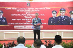 Bandarlampung ( Mediamerdeka)—— Sekretaris Daerah Provinsi Lampung Fahrizal Darminto menghadiri acara Serah Terima Jabatan Kepala Kantor Wilayah Kemenkumham Lampung dari Plt. Iwan Santoso kepada Edi Kurniadi, di Aula Kantor Wilayah Kemenkumham Lampung, Bandar Lampung, Jum’at (11/3/2022). Pada kesempatan itu Sekdaprov Fahrizal menyampaikan harapan di bawah kepemimpinan Edi Kurniadi, Kanwil Kemenkumham …