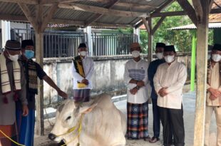 Gunung sugih ( Mediamerdeka)—Kapolres Lampung Tengah AKBP Wawan Setiawan,S.IK menyerahkan 3 Ekor Sapi untuk kurban kepada Panitia Kurban dilingkup Polres Lampung Tengah yang diterima Imam Rofi’i untuk disembelih, pemotongsb hewan tersebut dilaksanakan dipelataran halaman belakang Polres setempat, Selasa (20/7) Penyerahan Hewan Kurban tersebut juga disaksikan Ketua panitia Kompol Heri Sugito …