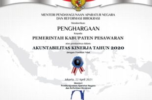 Pesawaran ( Mediamerdeka),-Pemerintah Kabupaten pesawaran mendapat penghargaan predikat B hasil evaluasi atas Sistem Akuntablitas Kinerja Instansi Pemerintah (SAKIP) Tahun 2020. Atas keberhasilan tersebut Pemkab Pesawaran mendapat piagam penghargaan dari Kementrian Pendayagunaan Aparatur Negara Dan Reformasi Birokrasi (KEMENPAN-RB) Republik Indonesia, KAmis (22/04/2021). Plt. Kepala Dinas Kominfo Kabupaten Pesawaran, Razak,S.Sos mengatakan Kemenpan-RB …