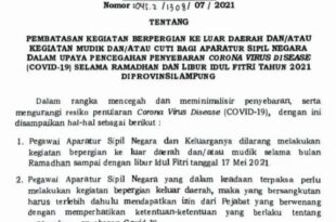 Bandarlampung ( Mediamerdeka )— Pemerintah Provinsi Lampung melarang Pegawai ASN dan keluarganya melakukan kegiatan bepergian ke luar daerah dan/atau mudik selama bulan Ramadhan sampai dengan libur Idul Fitri tanggal 17 Mei 2021. Hal itu tertuang dalam Surat Edaran (SE) Gubernur Lampung Nomor 045.2/1308/07/2021 yang ditetapkan pada tanggal 31 Maret 2021 …