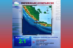 Pesawaran, Mediamerdeka.co – Gempa dengan kekuatan 2,1 magnitudo kembali getarkan Pesawaran pada Jumat (8/1/2031) pukul 11:38 WIB. Peristiwa ini terletak pada koordinat 5.54 LS dan 105.14 BT, atau tepatnya berlokasi di darat pada jarak 15 km Tenggara Pesawaran-Lampung. Dengan kedalaman 10 kilometer. “Dengan memperhatikan lokasi episenter dan kedalaman hiposenternya, gempabumi yang …