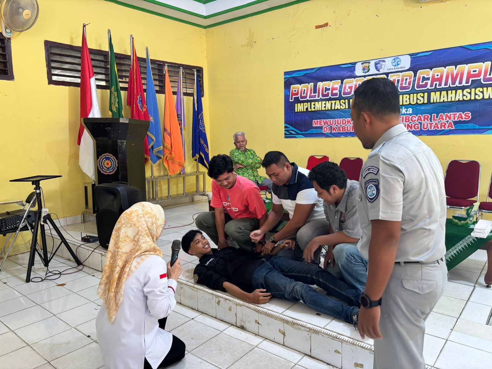 Kotabumi (MM) – Jasa Raharja berkolaborasi dengan Mitra Satlantas Polres Lampung Utara dan Dinas Kesehatan Kab Lampung Utara memberikan edukasi dan sosialisasi Keselamatan Lalu Lintas kepada Komunitas Mahasiswa sekaligus memberikan Pelatihan Pertolongan Pertama Gawat Darurat (PPGD) terhadap korban kecelakaan di Universitas Muhammadiyah Kotabumi Kab Lampung Utara, Rabu (28/05/2025),