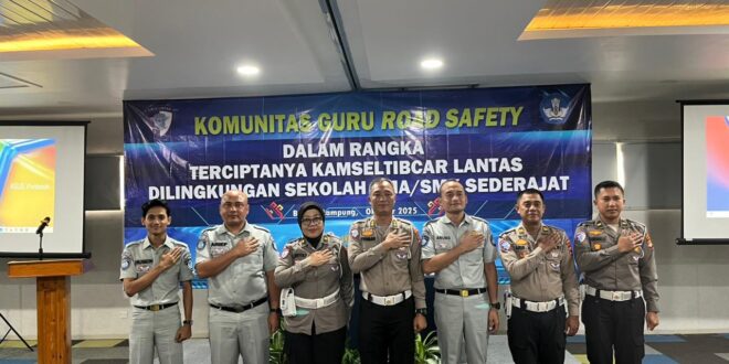 Bandar Lampung (MM) – Jasa Raharja bersama Subditkamsel Ditiantas Polda Lampung turut berperan aktif dalam kegiatan Guru Safety Road yang digelar di Meeting Room Hotel POP, kegiatan ini diikuti oleh 40 guru perwakilan SMA/SMK sederajat se-Kota Bandar Lampung sebagai bentuk upaya bersama dalam mewujudkan budaya keselamatan berlalu lintas sejak dini melalui peran tenaga pendidik, Rabu (22/10/2025).