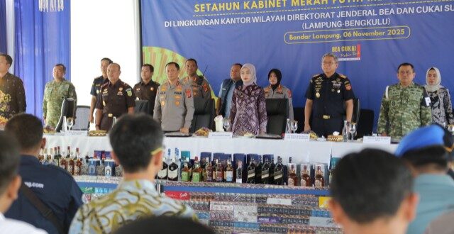 BANDARLAMPUNG — Pemerintah Provinsi Lampung bersama Kantor Wilayah Direktorat Jenderal Bea dan Cukai (DJBC) Sumatera Bagian Barat (Sumbagbar) melaksanakan pemusnahan barang hasil penindakan terhadap 29,18 juta batang rokok ilegal, 53,5 kilogram tembakau iris, serta 13,4 ribu liter minuman mengandung etil alkohol (MMEA), di Bandar Lampung, Kamis (6/11/2025).