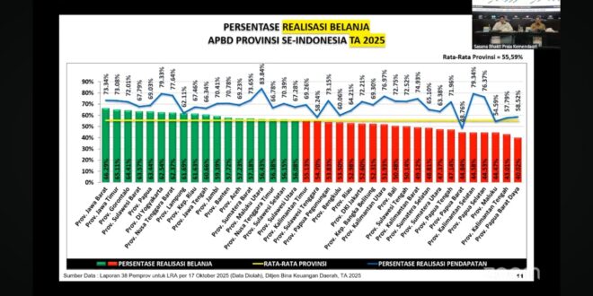 Per 30 September 2025, rata-rata realisasi pendapatan daerah telah mencapai 70,27 persen, meningkat dibandingkan tahun sebelumnya sebesar 67 persen. Namun, untuk sisi belanja daerah baru terealisasi 56,07 persen, sedikit menurun dibanding periode yang sama tahun lalu (57,20 persen).