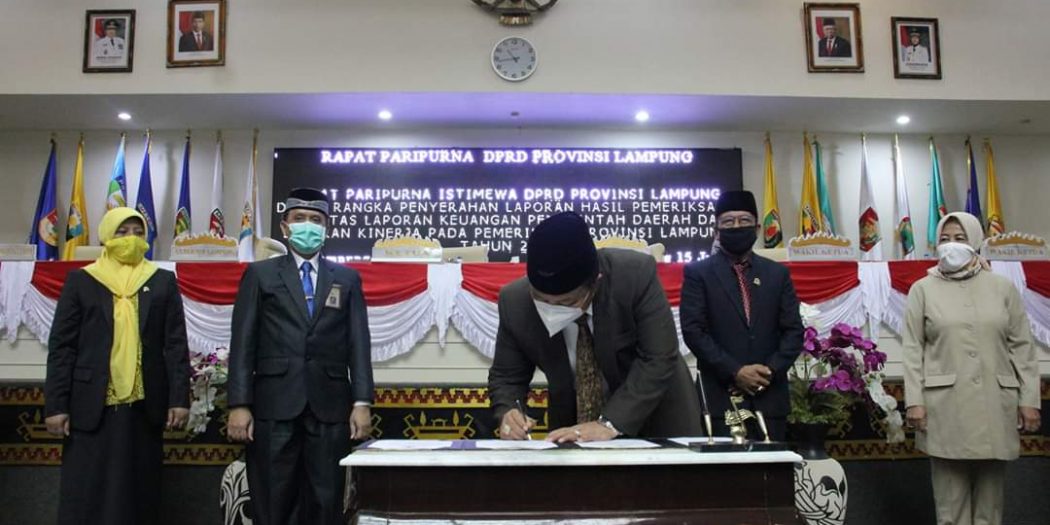 Bandarlampung, Mediamerdeka.co – DPRD Provinsi Lampung menggelar rapat paripurna istimewa dalam rangka penyerahan Laporan Hasil Pemeriksaan (LHP) BPK Perwakilan Provinsi Lampung atas Laporan Keuangan Pemerintah Daerah (LKPD) dan Laporan Kinerja Provinsi Lampung tahun 2019, kemudian dilanjutkan Rapat Paripurna pembentukan Panitia khusus (Pansus) pembahasan Laporan hasil pemeriksaan (LHP) BPK RI Perwakilan Provinsi Lampung atas Laporan Keuangan Pemerintahan Daerah (LKPD) dan Laporan Kinerja Provinsi Lampung tahun 2019. (Senin,15 Juni 2020)