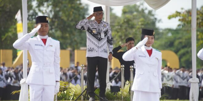 LAMTENG — Gubernur Lampung, Rahmat Mirzani Djausal memimpin upacara peringatan Hari Ulang Tahun (HUT) ke-80 Persatuan Guru Republik Indonesia (PGRI) dan Hari Guru Nasional 2025 tingkat Provinsi Lampung di Lapangan Merdeka, Gunung Sugih, Lampung Tengah, Selasa (25/11/2025).