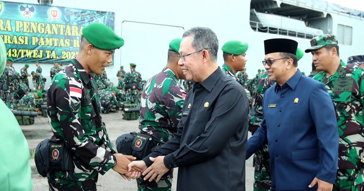 Bandarlampung (Mediamerdeka)— Gubernur Lampung diwakili Sekretaris Daerah Provinsi Lampung Fahrizal Darminto menghadiri Upacara Pengantaran Satgas Operasi Pamtas RI-PNG Yonif 143/TWEJ TA. 2022 bertempat di Pelabuhan Panjang, Sabtu (01/10/2022).