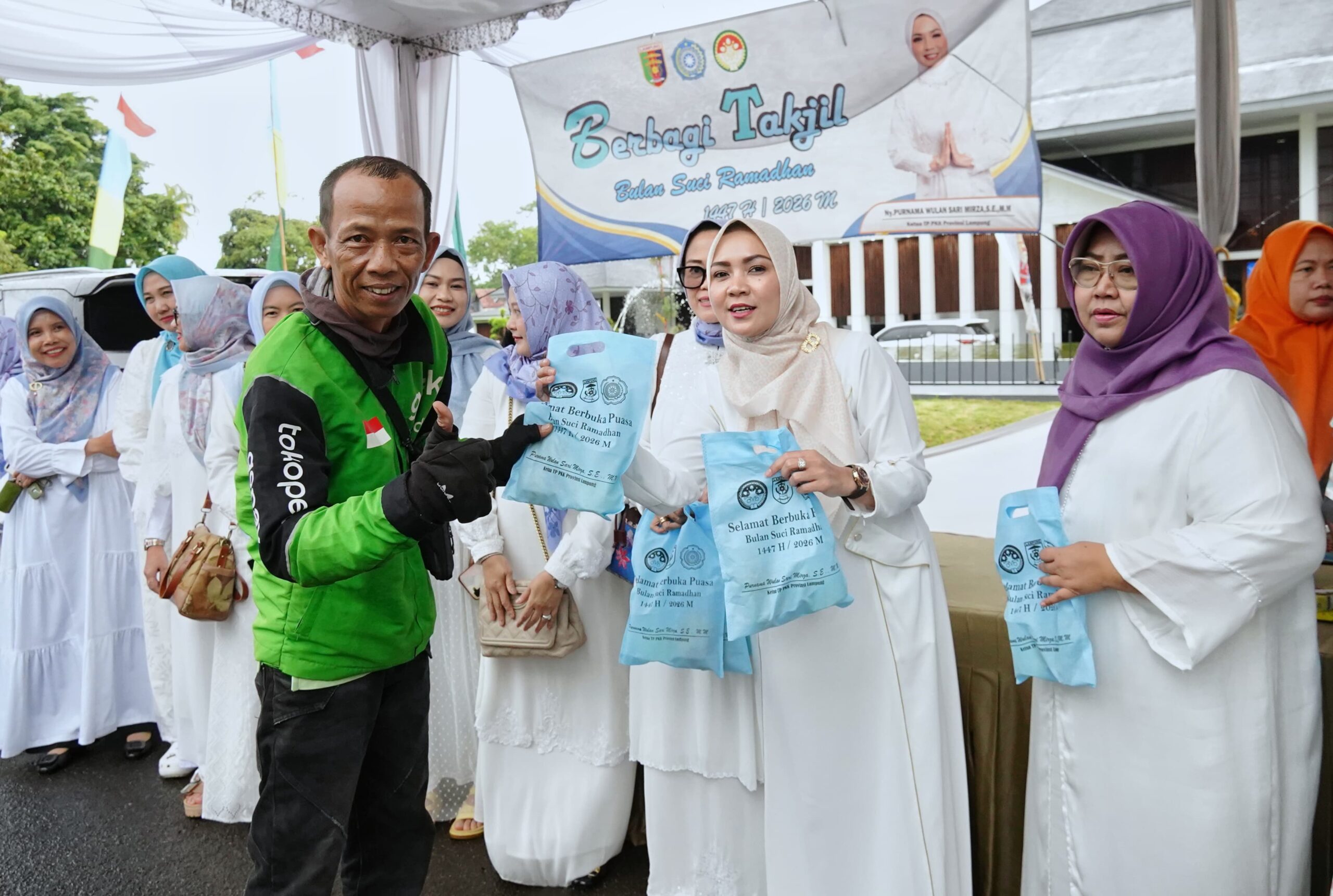 Bandar Lampung — Hujan deras yang mengguyur Kota Bandar Lampung tidak menyurutkan semangat berbagi dalam kegiatan pembagian takjil Ramadan 1447 Hijriah yang digelar Tim Penggerak PKK Provinsi Lampung bersama Dharma Wanita Persatuan (DWP) Provinsi Lampung di Mahan Agung, Jalan Dokter Susilo, Jumat (06/03/2026).