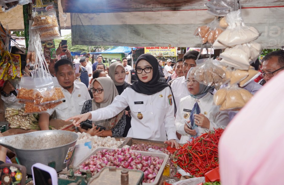 Bandar Lampung (MM) – Wakil Gubernur Lampung, Jihan Nurlela melakukan peninjauan terkait Ketersediaan bahan pangan dan Harga Bahan Pokok menjelang Bulan Suci Ramadan bertempat di Pasar tradisional Kangkung, Rabu (26/02/2025).